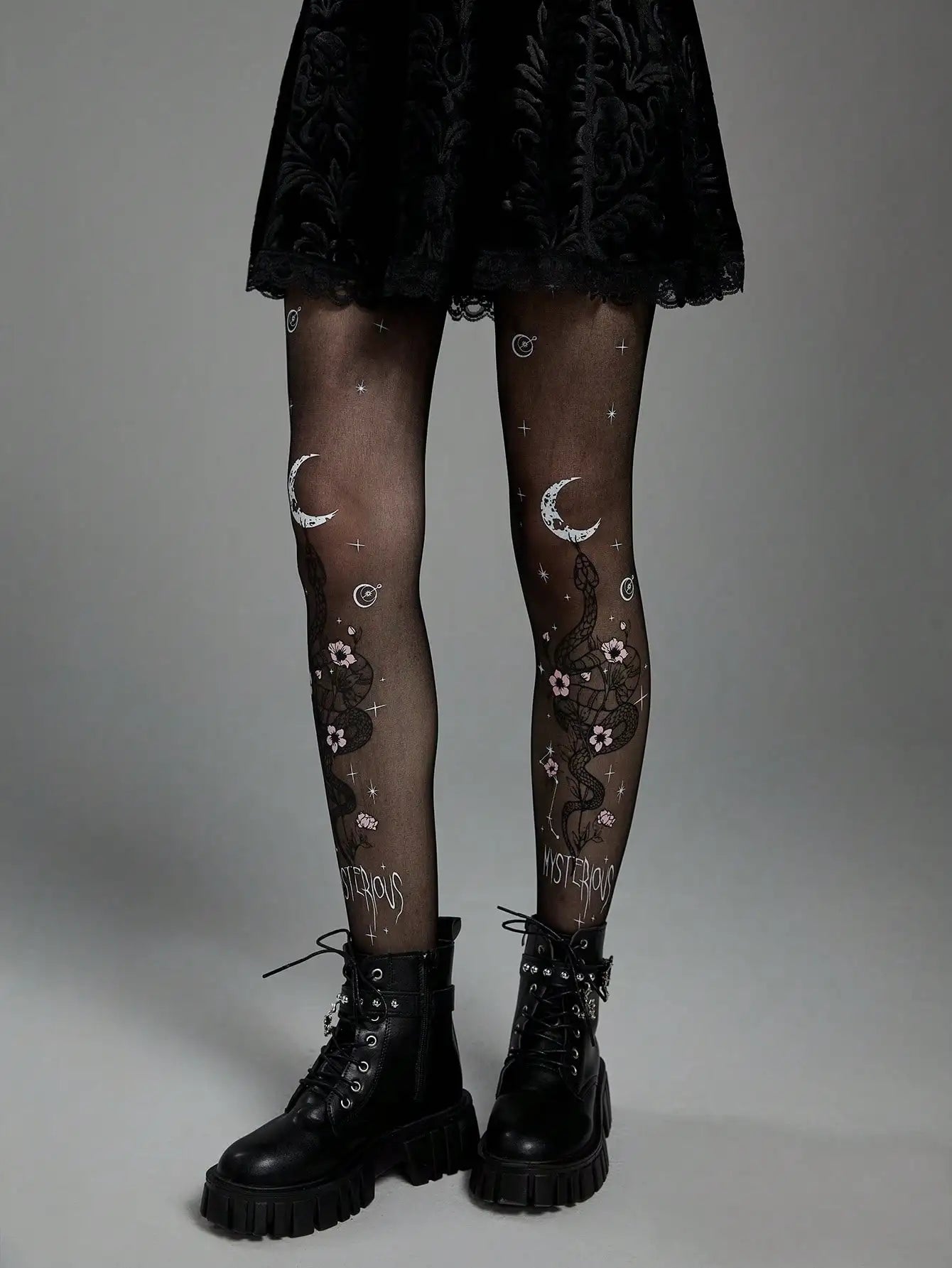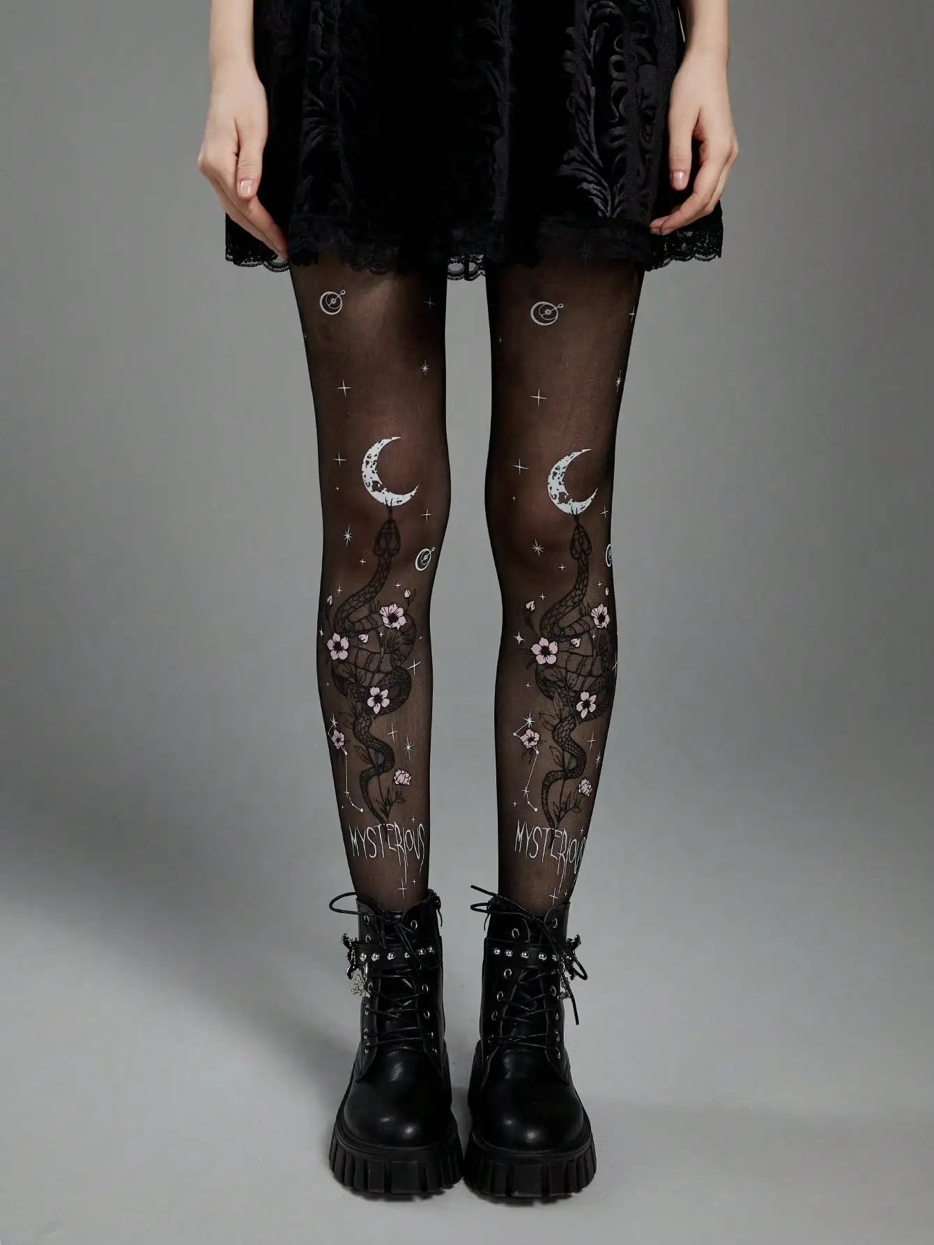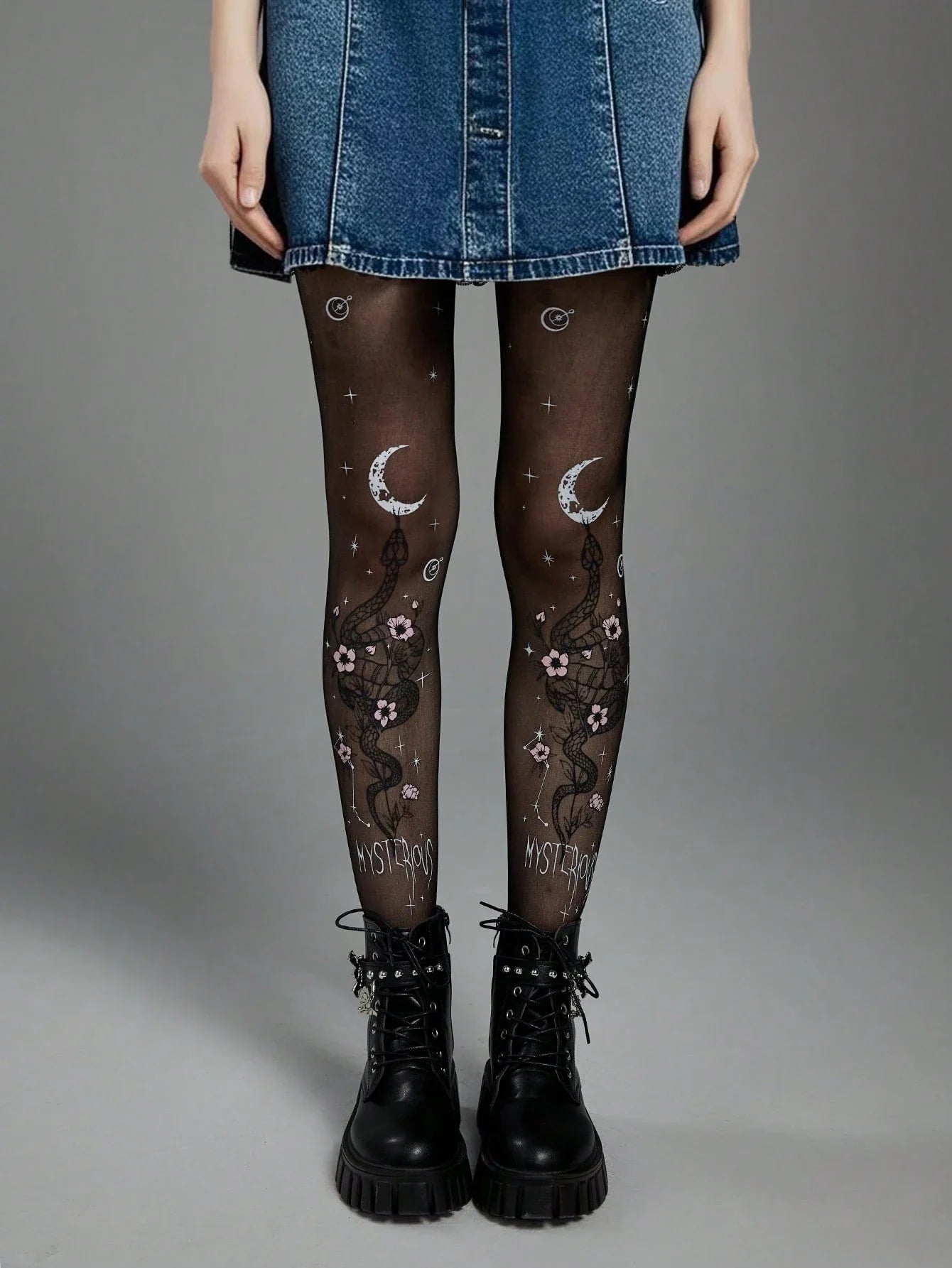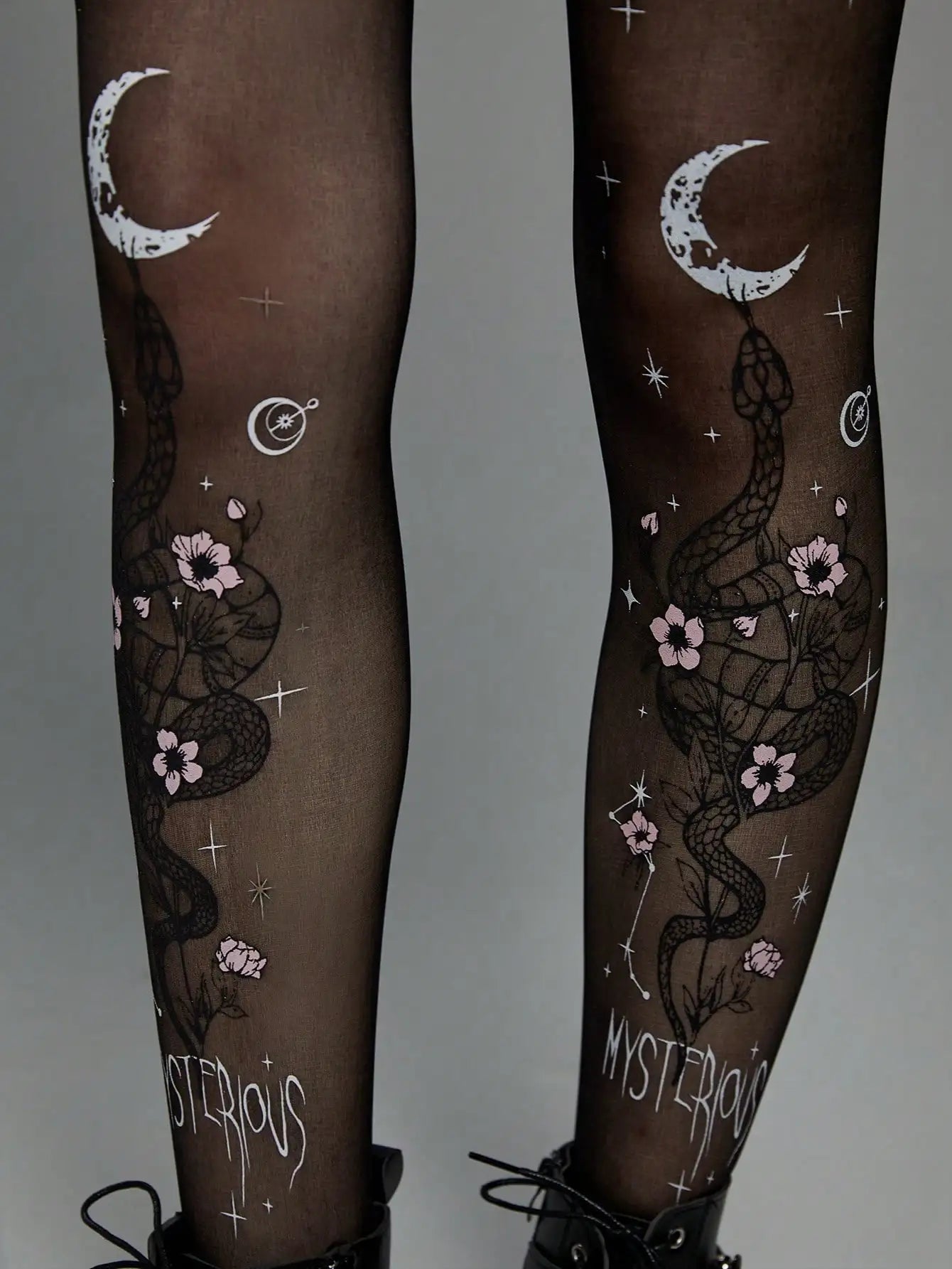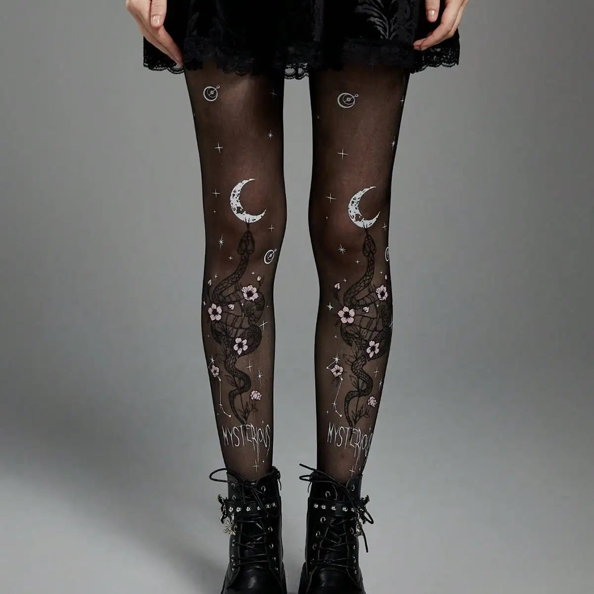 Slip into shadows with these Black Snake and Moon Print Stockings. Featuring an eerie blend of winding snakes and celestial moons. they add a dark. mystical edge to any outfit. Crafted for a snug. comfortable fit. these stockings perfectly complement gothic styles. enhancing your look with subtle. otherworldly allure.