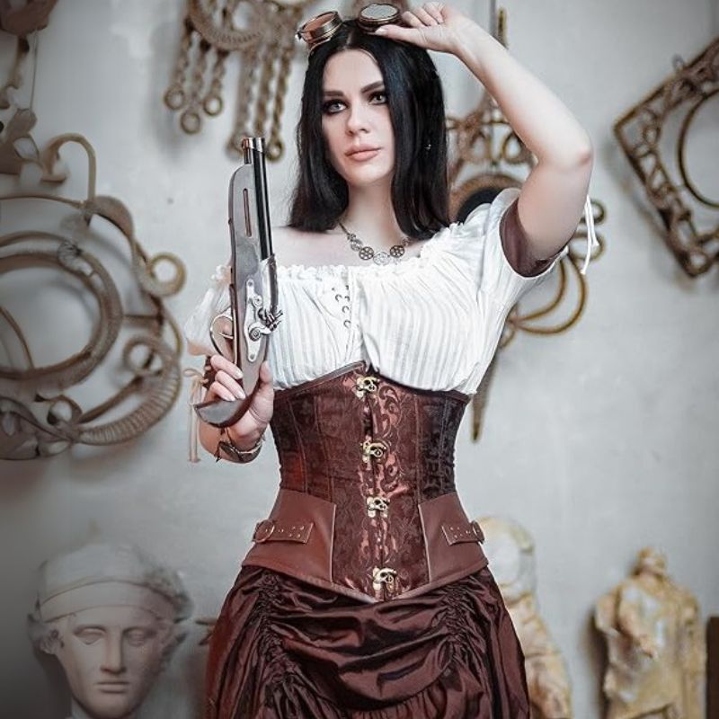 If you are looking for a corset to match your Steampunk clothes. this Steampunk underbust corset is all you need. This corset has been specially designed to help you slim your waist. The corset is decorated with four beautiful copper-plated hooks. mounted on a pivot. The faux leather sides are embellished with a tightening strap and contrast wonderfully with the brocade fabric. There is a large lacing on the back to adjust it properly. The corset is also available in black if you are looking to accentuate the dark side of your Steampunk persona.