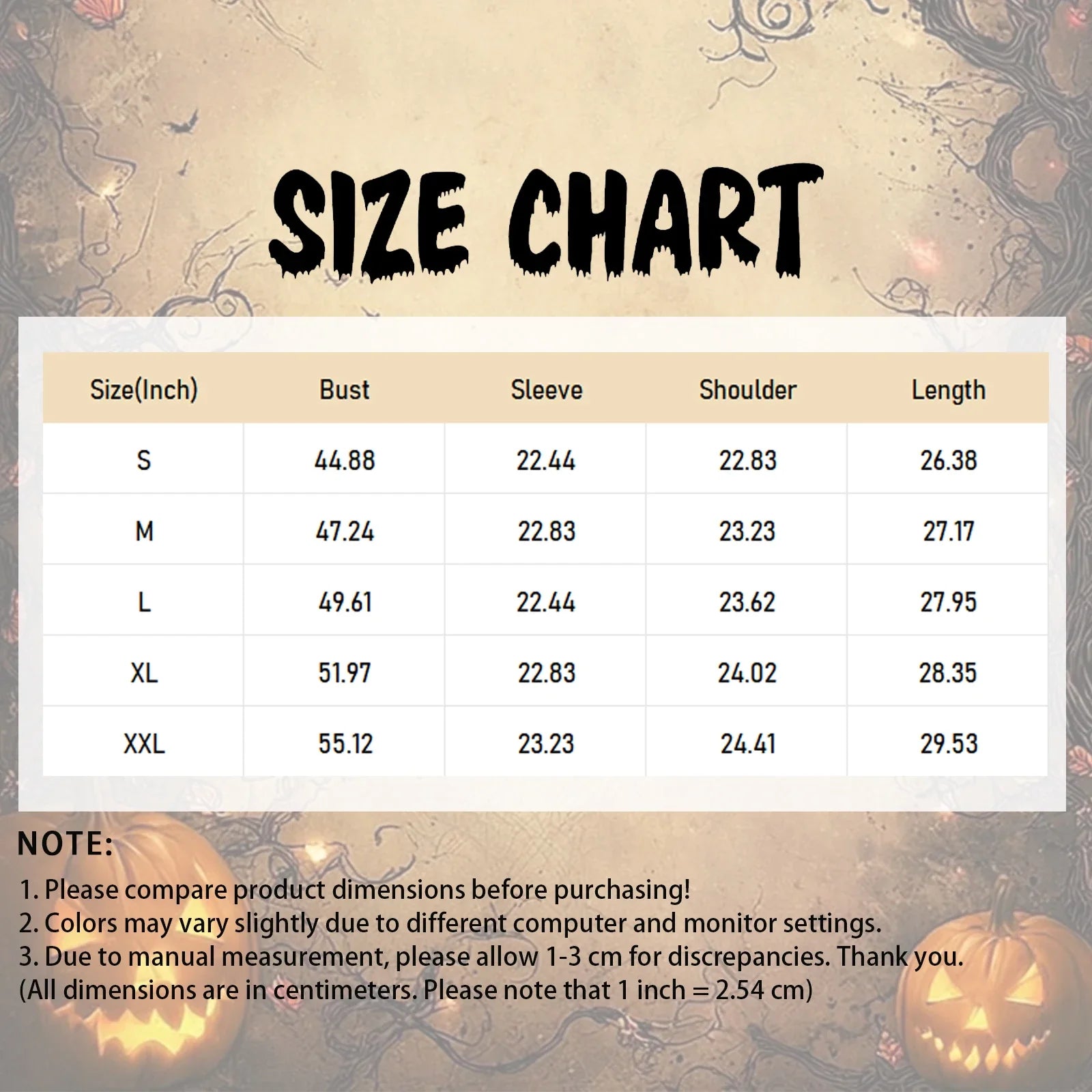 | Size | Bust | Sleeve | Shoulder | Length |