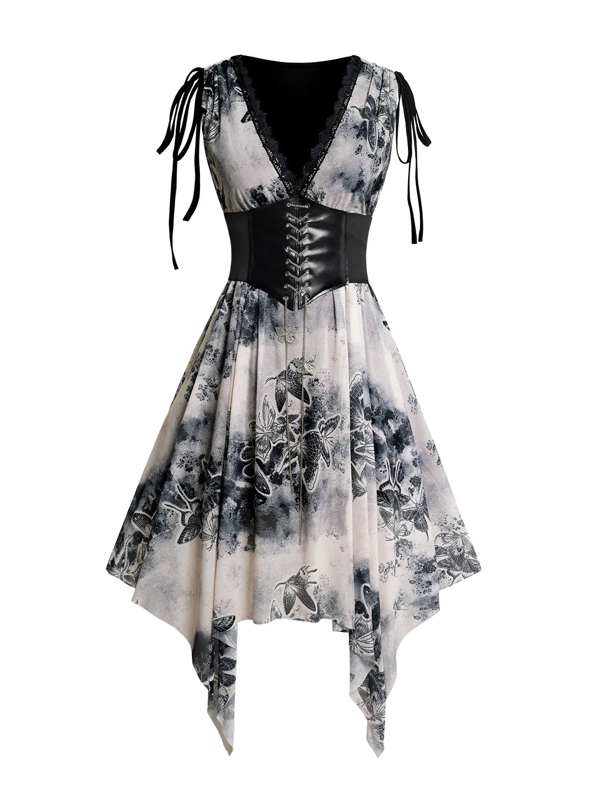 Our elegant steampunk dress combines vintage charm with modern design elements. making it a must-have for any fashion-forward individual. The butterfly print. plunge neck. and lace up removable corset offer a perfect balance of femininity and boldness. Whether you're attending a themed event or simply want to add a touch of elegance to your wardrobe. this dress is the ideal choice for making a lasting impression.