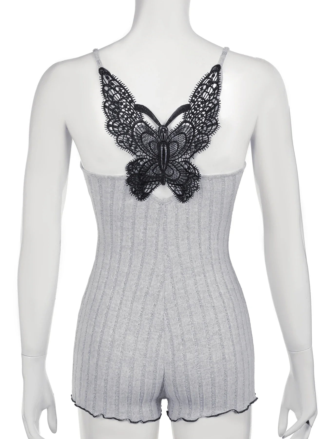 Flutter into style with our Gray Alt Patchwork Butterfly Lace Bodysuit. Perfect for adding a touch of whimsy to any outfit. (Get ready to spread your wings and fly in this playful bodysuit!)