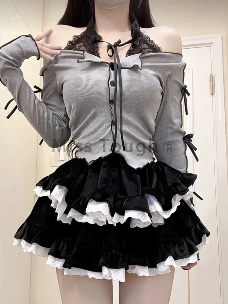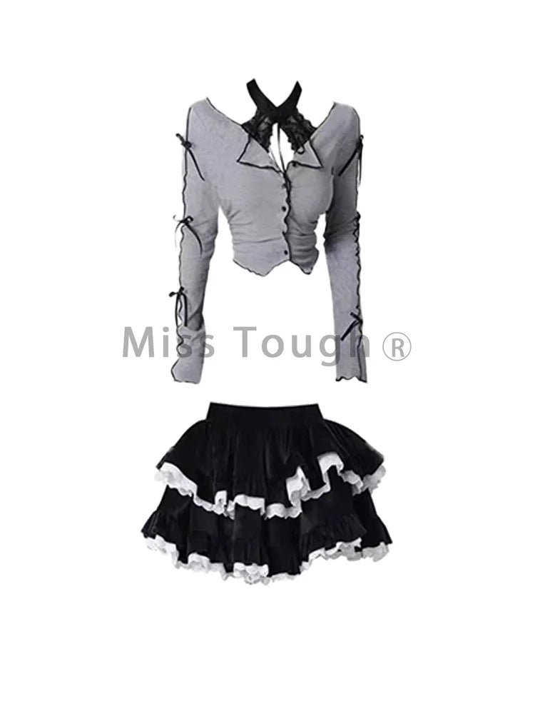 Grey Black Kawaii Lolita Two Piece Skirt and Top Set