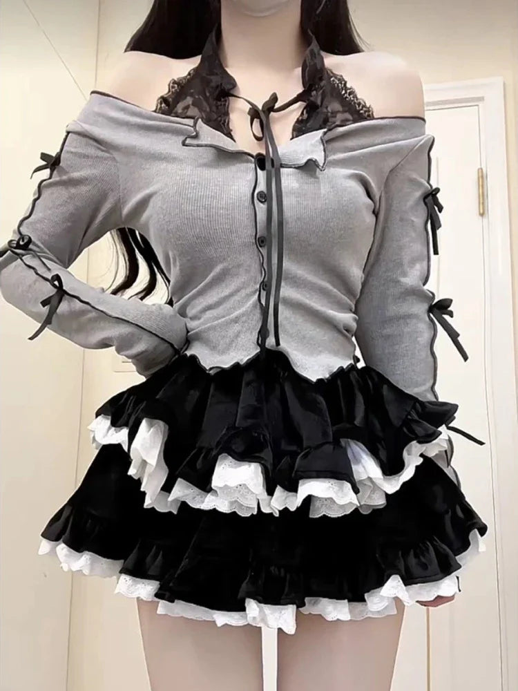Transform into a cute and stylish Lolita with our Grey Black Kawaii Two Piece Set. This set includes a trendy skirt and a matching top for an effortlessly charming look. Perfect for casual outings or dress it up for special occasions. Embrace kawaii fashion with this adorable set!