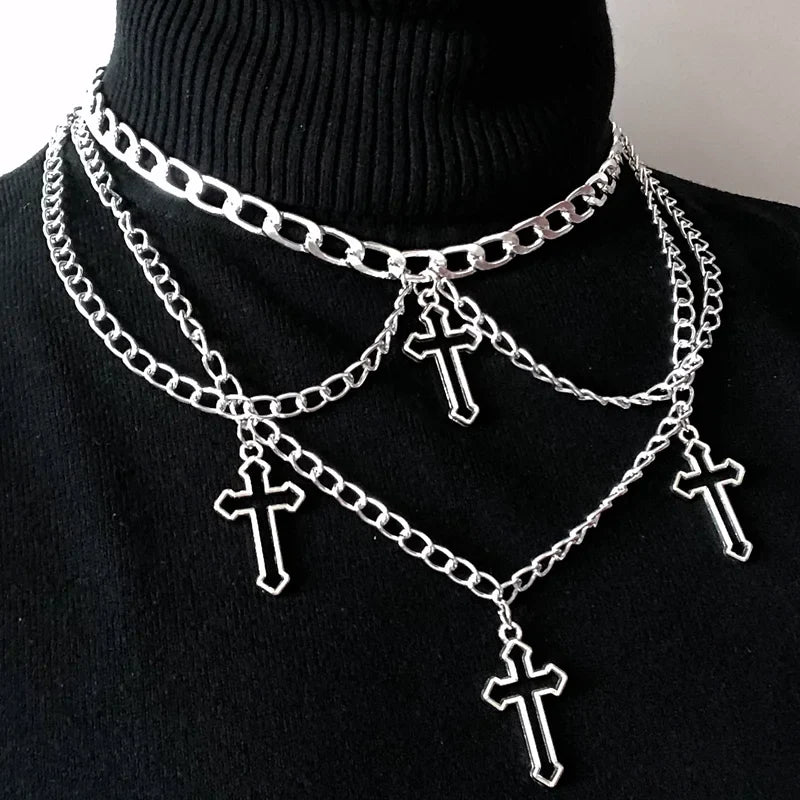 Add some edge to your outfit with our Grunge Multi Cross Chain Choker Necklace! The perfect mix of boldness and beauty. This gothic necklace is essential for any fashion-forward person.