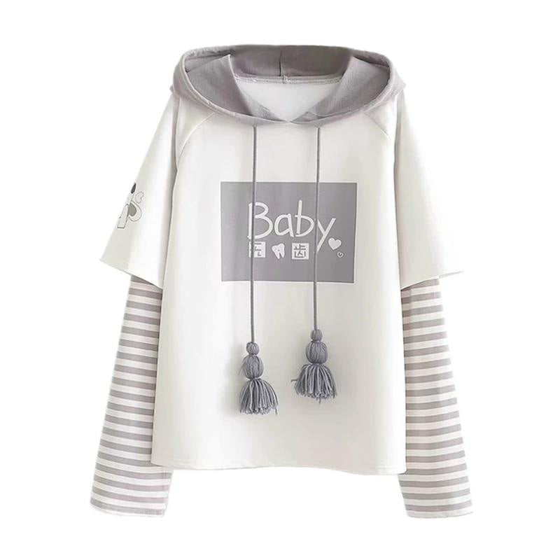 • Thiscutegrey japanese inspired "Baby" hoodie withstriped layered sleeves is a must have for any Ellezylooking toembrace theiryouthful side in a neutral tone!