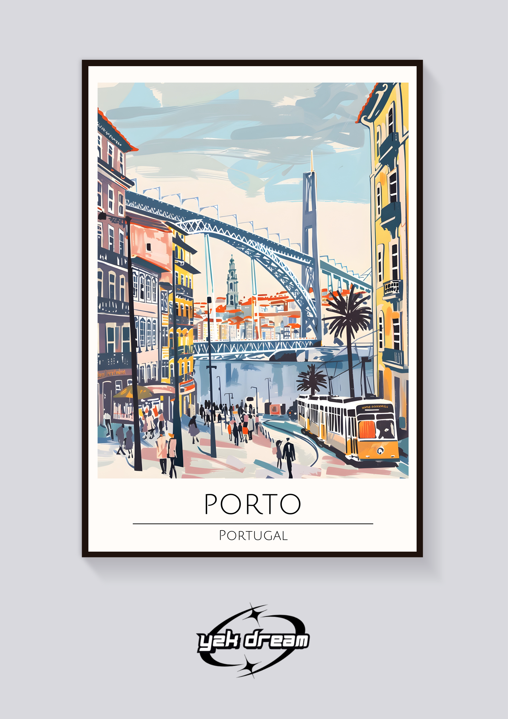 Stylish art deco travel print of Porto. Portugal. Features Dom Luís I Bridge. traditional buildings. a classic yellow tram. and the Douro River. ideal as aesthetic wall art or retro room decor.