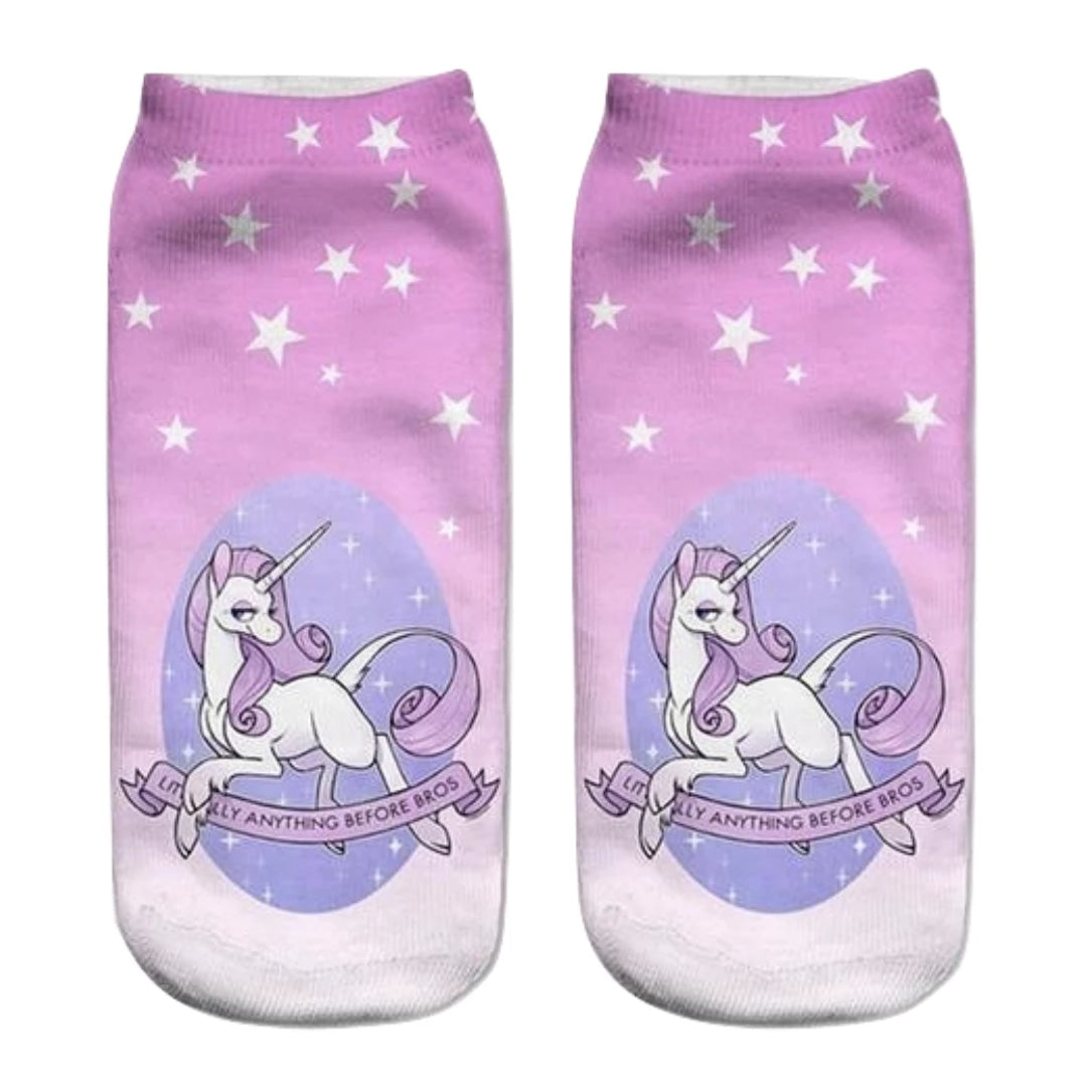 • A super kawaii pair of magical purple unicorn ankle socks featuring a cute celestial white unicorn prancing with the words "Literally Anything Before Bros"! So cheeky!