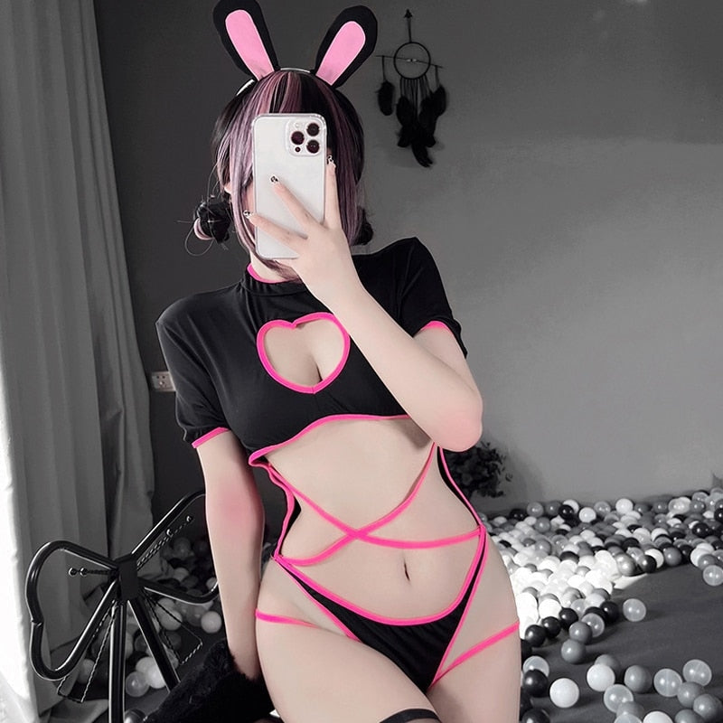 • Made of comfortablestretchy fabric with a black & pink aesthetic. cute matching bunny ears. criss-cross lacesacross the torso. and a heart peephole on the chest!