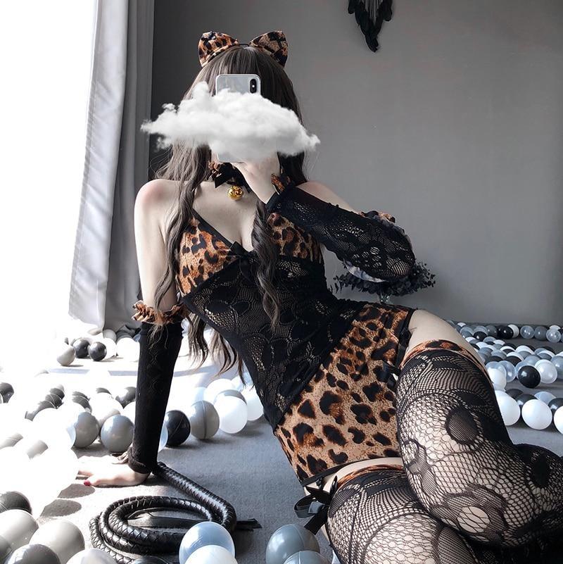 • This sassy leopard print black lace costume set has gorgeous hand-details including beautiful black lace midsection on a leopard printed bodysuit. matching leopard cat ears and all the fixings for a purrrrfect kitten leopard set!