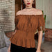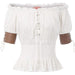 This Steampunk bare shoulder shirt will complete your steampunk outfit with a guaranteed retro touch. Steampunk women will appreciate the aesthetic details of this Victorian shirt. including leatherette mid-length sleeves. an elastic collar for comfort and a smocked waist for a slim fit.