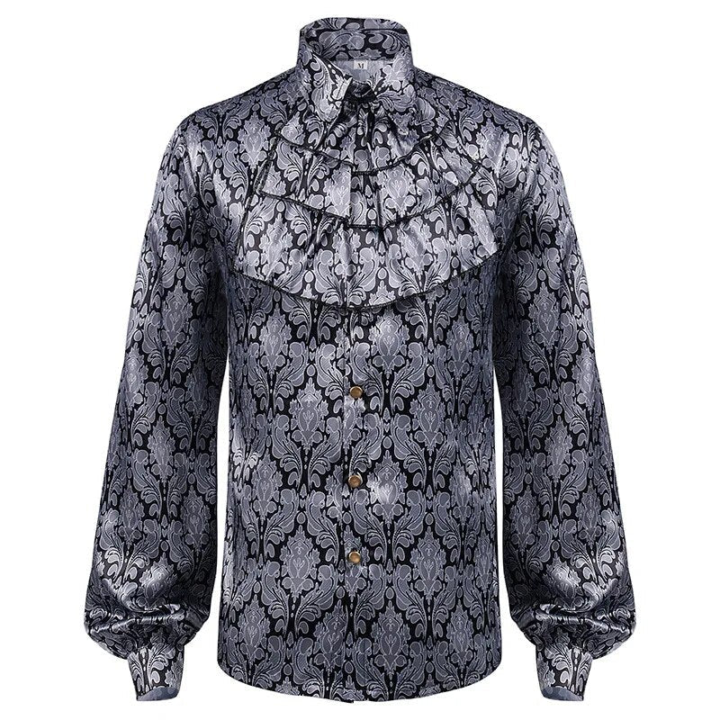 his striking piece. featuring an intricate combination of silver and black baroque patterns. is a true testament to your unique sense of fashion. Crafted with meticulous attention to detail. this shirt seamlessly blends elements of the Victorian era with a hint of gothic allure. The intricate baroque design exudes sophistication. while the steampunk influence adds a touch of industrial flair.