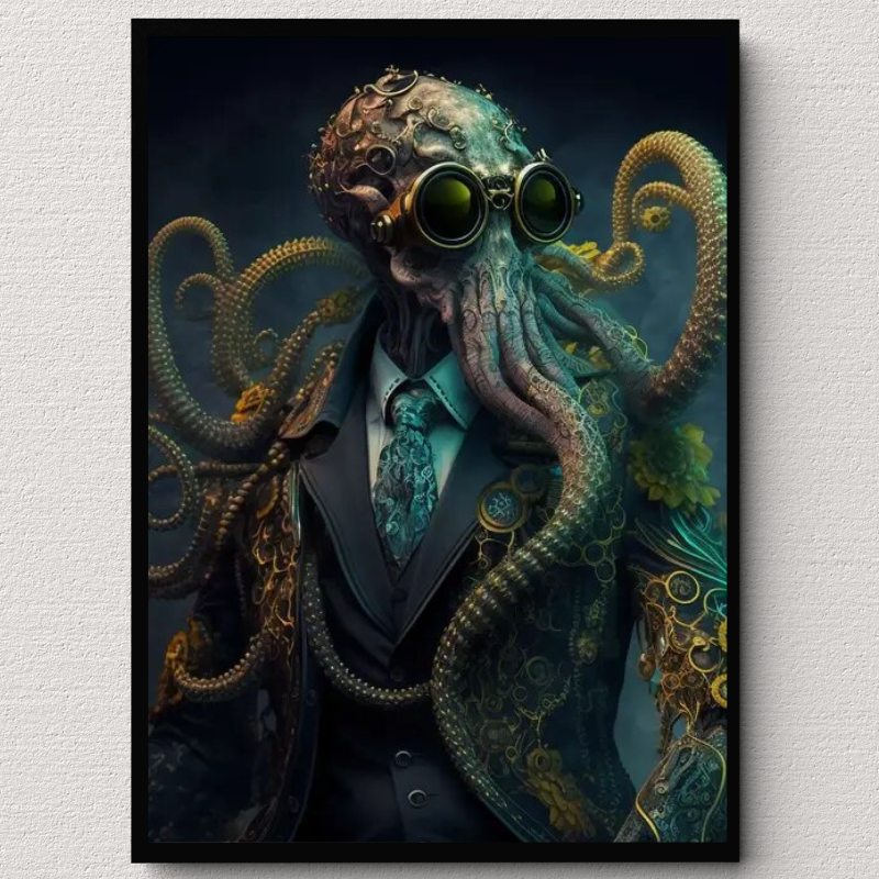 Immerse yourself in the extraordinary allure of our Steampunk Octopus Wall Art. This captivating piece portrays a fascinating amalgamation of man and octopus. adorned with captivating steampunk elements.