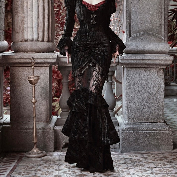Elevate your steampunk style with our premium Steampunk velvet mermaid skirt. Crafted from high-quality black velvet. this skirt is a masterpiece of elegance and luxury. Designed to capture the essence of the steampunk aesthetic. this mermaid skirt boasts a sleek and flattering silhouette that hugs your curves in all the right places. The premium velvet fabric is soft to the touch and drapes beautifully. ensuring both comfort and style. It's the perfect addition to your steampunk wardrobe for special occasions.