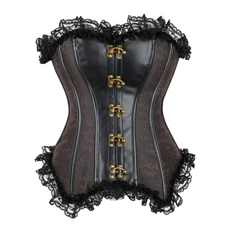 Elevate your steampunk ensemble with our steel bone Steampunk corset. Crafted with brown jacquard patterns and leather. this corset epitomizes Victorian elegance and meets the industrial edge. The vintage clasps. delicate ruffles. and sturdy lace-up back ensure a perfect fit while adding a touch of timeless sophistication. This corset provides the structure and support you need to feel confident and look stunning. Whether for a steampunk convention. a themed party or a special gathering. This unique corset is your go-to piece for an unforgettable look!