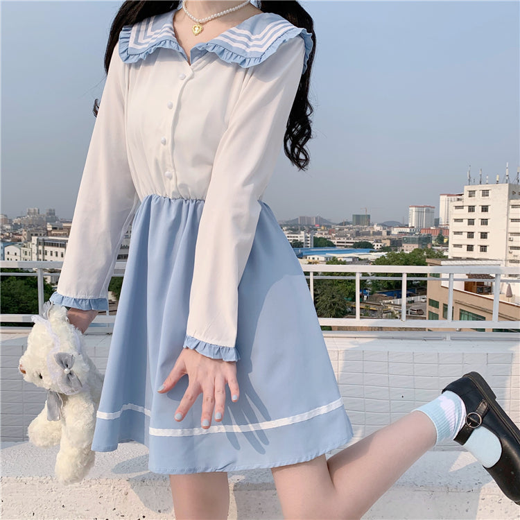 • With a beautiful blue sailor collar. and a flowing skirt. this cute one piece dress will instantly transform you into a school girl with style!