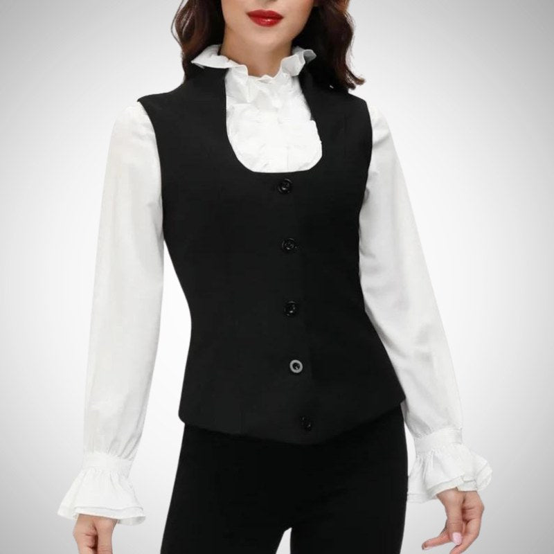 Transform your look with our vintage women's vest. a timeless piece that effortlessly combines elegance and vintage charm. Crafted with meticulous attention to detail. this black vest features a sleek design that beautifully accentuates a jabot collar. making it the perfect addition to your retro. Victorian. or steampunk-inspired outfits.