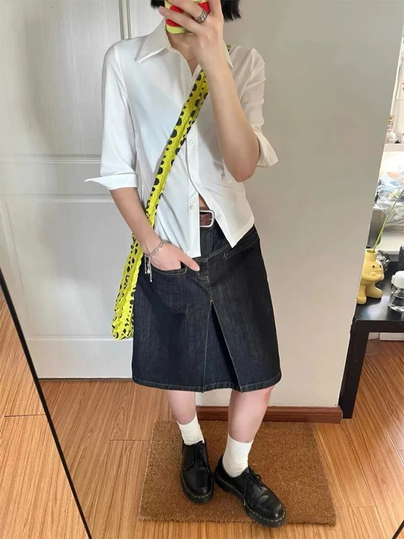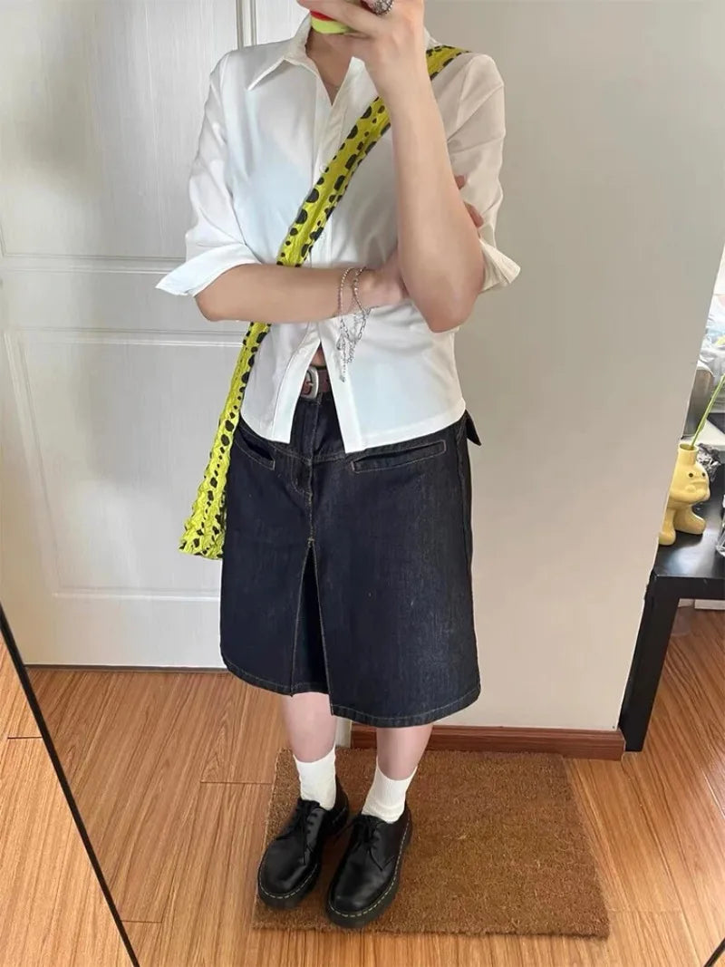 Made from dark wash denim. it has a slim fit cut that shapes the waist and flows down into a simple midi length. The small front slit adds just enough movement to the skirt. keeping it practical while holding onto that vintage Y2K look.