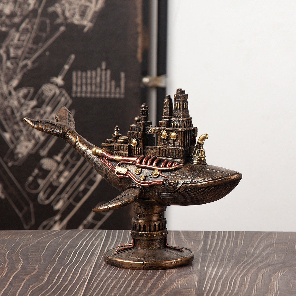 Dive into a world of steampunk fantasy with our exquisite Steampunk whale sculpture. Crafted with meticulous attention to detail. this stunning piece is made from high-quality resin and showcases the perfect blend of marine magnificence and industrial aesthetics. The majestic whale. with its graceful curves and intricate mechanical elements. transports you to an alternate reality where steam-powered contraptions rule the seas. The combination of brass. copper. and bronze accents adds a touch of vintage charm. while the weathered finish gives it an antique allure. This handcrafted masterpiece is a true conversation starter. serving as a centerpiece for your home or office. Display it on a shelf. desk. or mantel. and watch as it sparks intrigue and admiration from all who behold its beauty. Not only does this Steampunk sculpture add a touch of wonder to your space. but it also showcases your appreciation for art and creativity. It's an ideal gift for steampunk enthusiasts. maritime lovers. and anyone with an affinity for unique and imaginative decor.