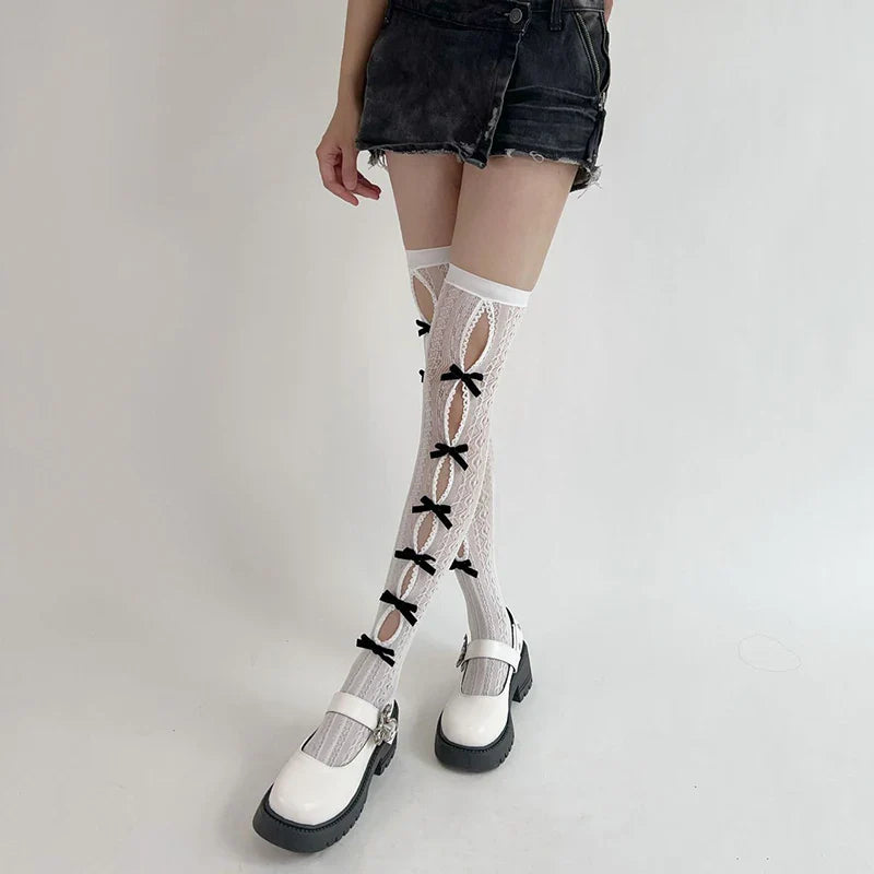 Unleash your inner Lolita with these flirty White Bow Tie Lace Stockings! The delicate lace adds a touch of elegance. while the playful bow tie detail adds a touch of sass. Perfect for completing any outfit!