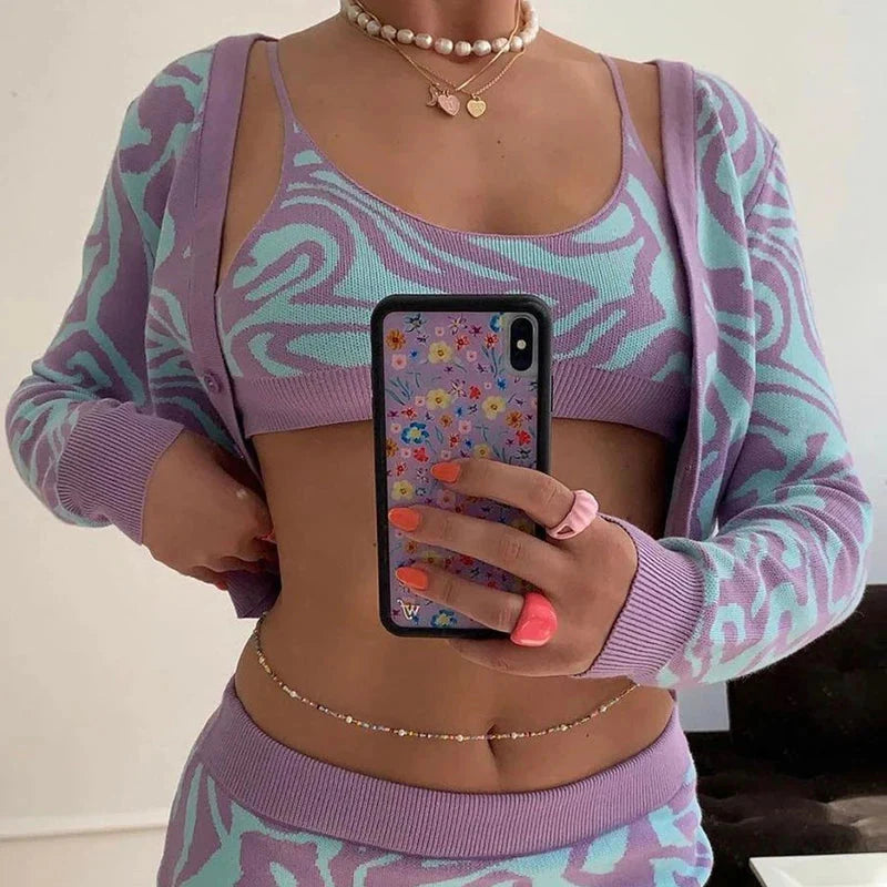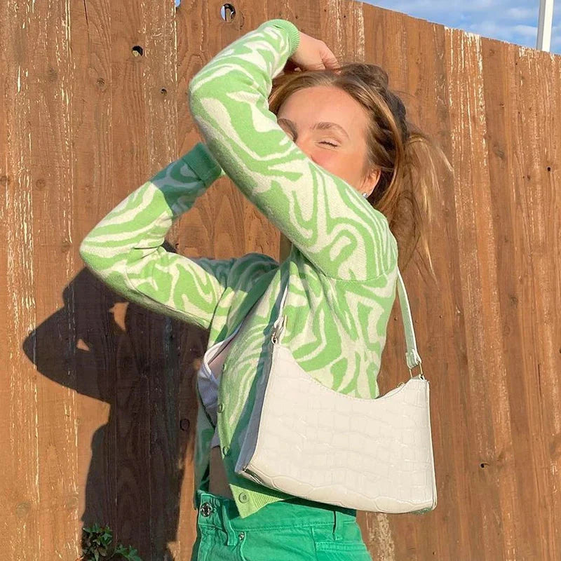 Available in two vibrant colours. this cardigan jumper gives off the perfect blend of retro vibes and modern-day comfort. Whether you go for the green or purple. this women's cardigan is designed to bring that effortlessly baggy fit that has become synonymous with early 2000s fashion. The button-down front and abstract print add a stylish touch. making this piece a perfect addition to your summer wardrobe when you want to layer without compromising on sleek. trendy style.