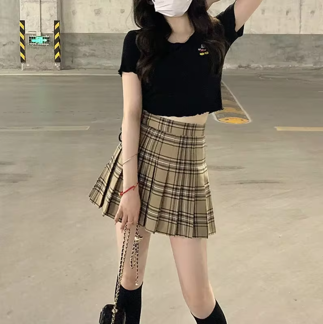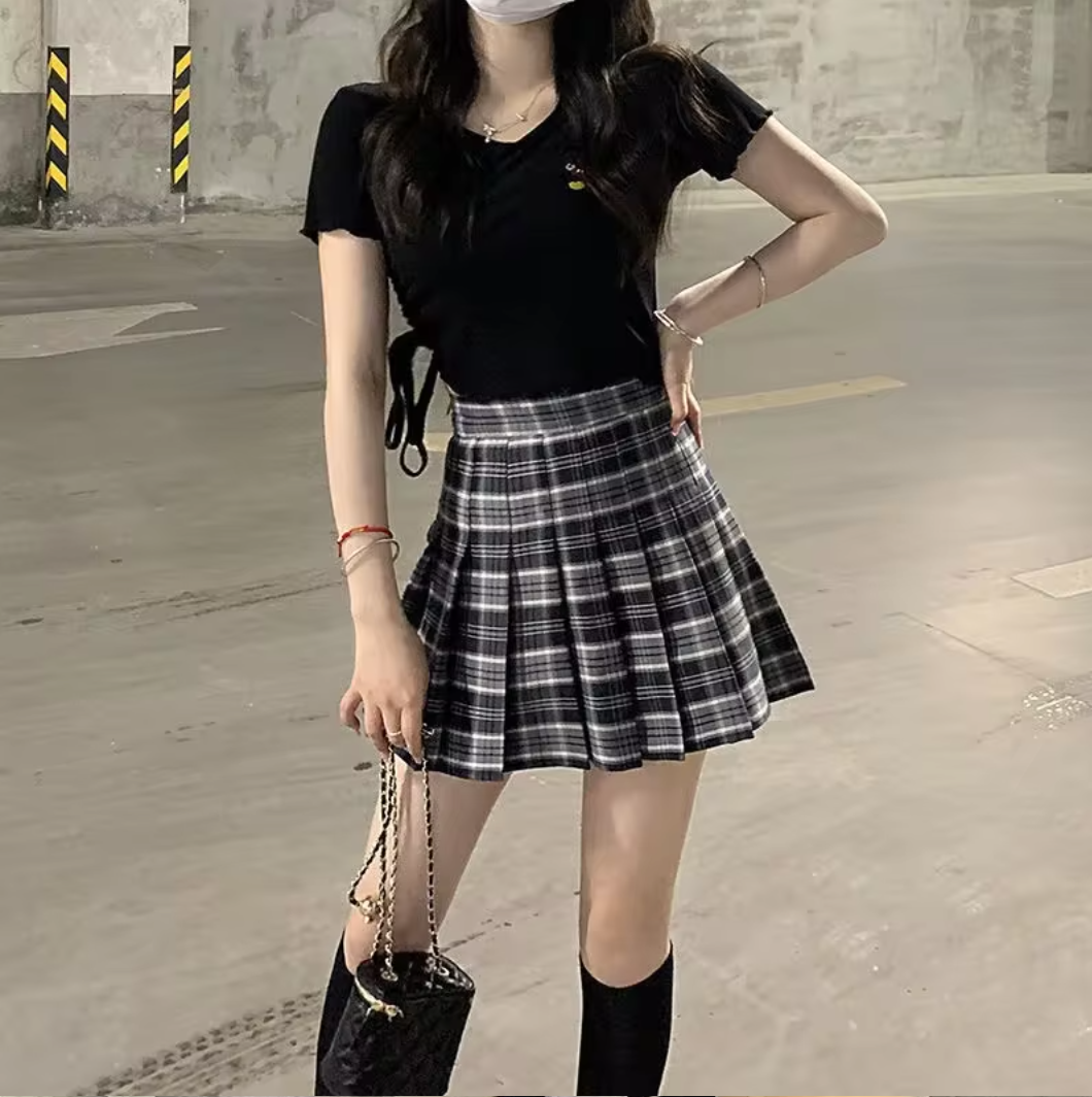 Pair this plaid mini skirt with a baby tee or a fitted crop top. If you're aiming for a more edgy aesthetic. consider styling it with a graphic tee or a grunge top. When it comes to footwear. chunky platform boots or sleek strappy sandals will complement the skirt's vibe perfectly. Don't forget to accessorise with a choker. hoop earrings. or a chain belt.