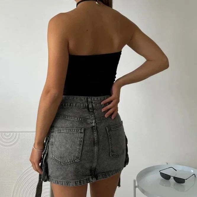 The high-waisted fit accentuates your silhouette. while the mini length keeps your look playful and flirty. The cargo pockets are not just for show—they add a functional element. allowing you to carry your essentials with ease. The strappy details along the sides give this skirt a unique edge. making it a standout piece for any occasion.