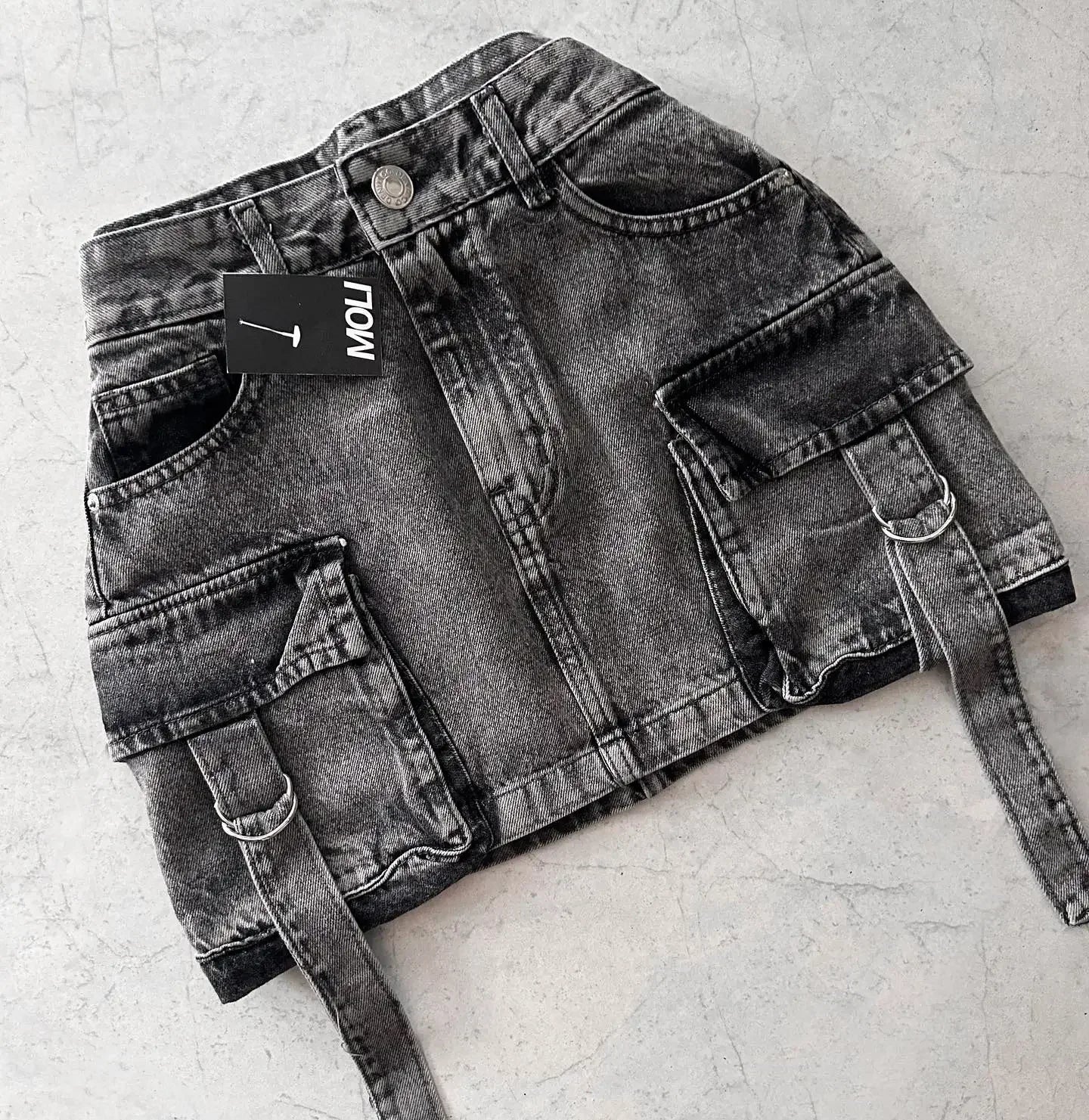 This edgy mini skirt features a rugged. distressed denim finish that gives it a vintage feel. while the cargo pockets and strappy details add a modern twist.