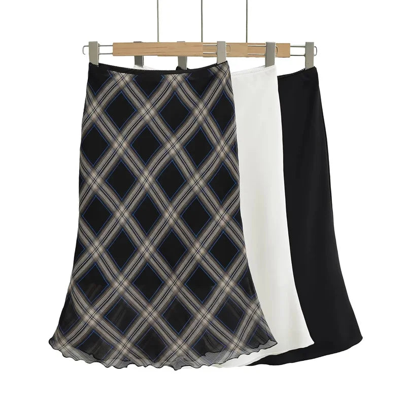 A low-key must-have for your wardrobe. This women's mini skirt features a soft plaid pattern that feels fresh but still chill enough for everyday looks. The floaty mesh layer gives it a light feel and the lettuce-style trim adds a soft touch without doing too much.